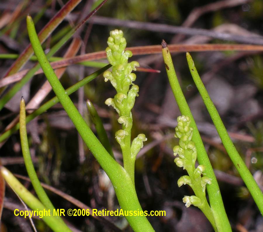 Found in Victoria, Tasmania, South Australia and Western Australia at elevations of sea level to 300 meters in low lying areas and swamps often in shallow water as a miniature sized, cold growing terrestrial with a filiform, often yellow green, solid leaf that blooms in the spring on an erect, 2 to 5" [5 to 12.5 cm] long, 2 to 40 flowered inflorescence with densely packed, slightly fragrant flowers.