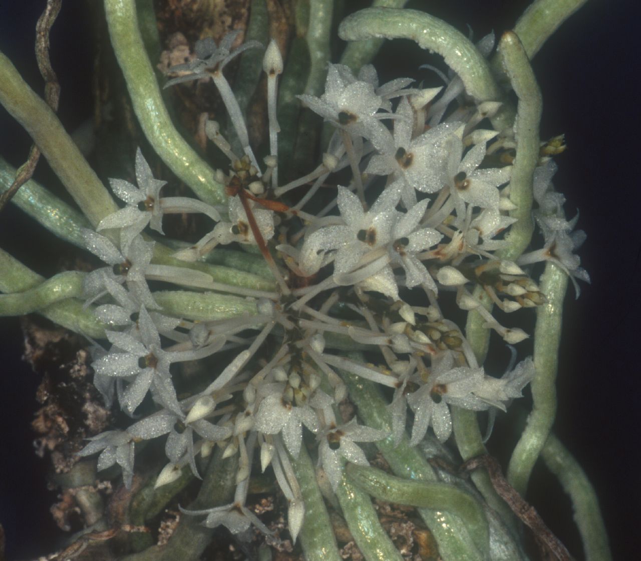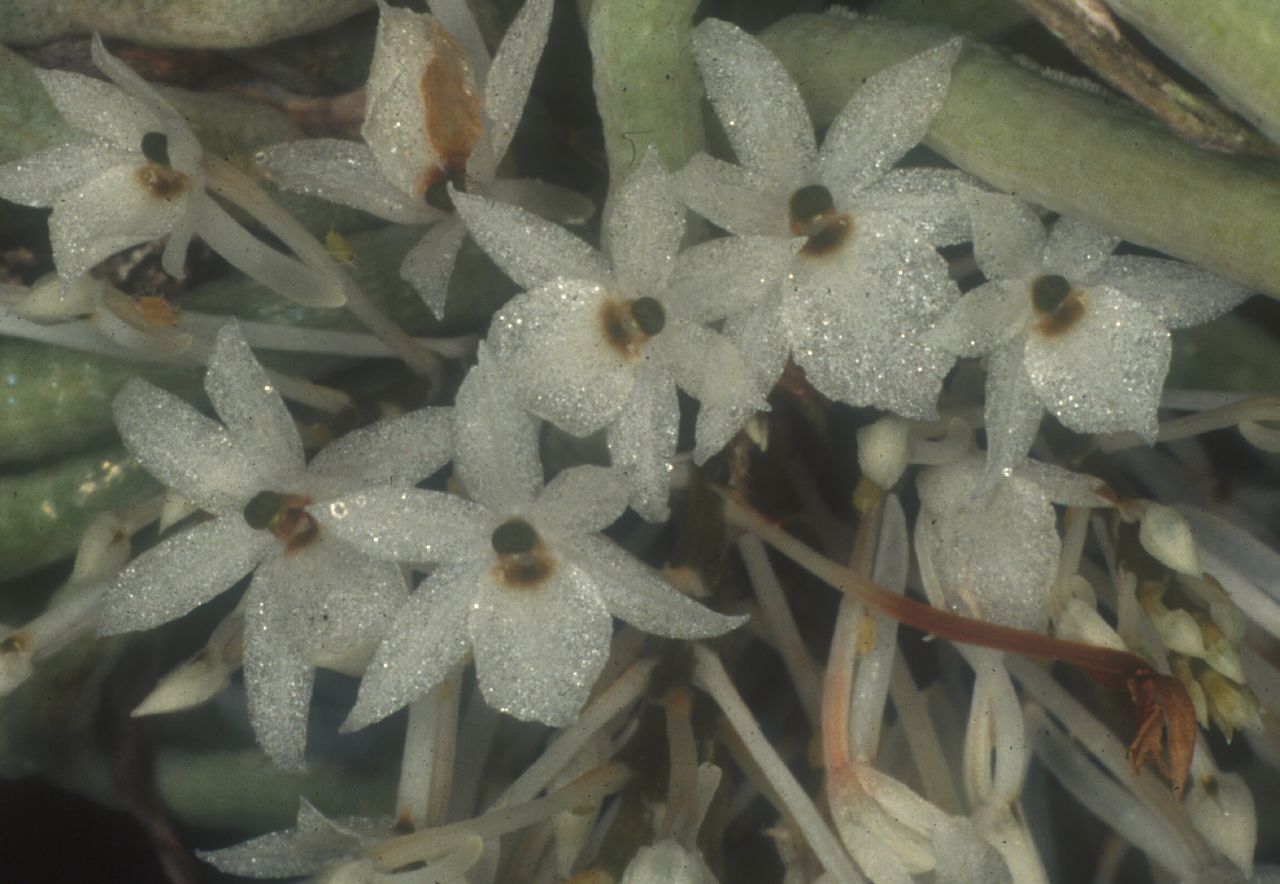 Found in Zaire and Zambia in riverine forests and woodlands bordering swampy grounds at elevations of 750 to 1500 meters as a small sized, warm to cool growing epiphyte on twigs and branches often forming large colonies with masses of grey, sometimes flattened roots often forming a conical mass that blooms in the spring on up to 8, simultaneous, .6 to 1.4" [1.5 to 3.5 cm] long, straight, terete usually dense, to 15 flowered inflorescence with sheathing bracts only towards the base, all the rest ovate, more or less acuminate, single nerved and carrying all the scentless flowers crowded towards the apex.