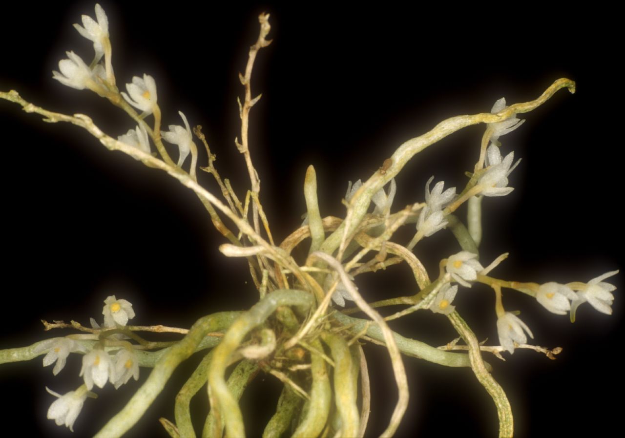 Found in Kenya, Tanzania and Zimbabwe in seasonally dry montane forests on twigs of trees and bushes at elevations of 670 to 1800 meters as a mini-miniature sized, warm to cool growing, twig epiphtye with silver grey roots radiating from a short stem that blooms in the early spring on up to 4, light green, flexuous, angular, .8 to 1.2" [2 to 3 cm] long, to 8 flowered inflorescence with ovate, acute to subacute, single nerved, non-sheathing floral bracts and carrying to 4 simultaneously opening flowers.