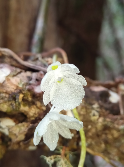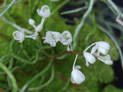 Found in Madagascar in rainforests near streams at elevations of sealevel to 1000 meters on branches as a small sized, hot to warm growing epiphyte with cylindrical roots blooming in the summer through fall on up to 5 to 8, simultaneous, very short, rigid, upright to spreading, 3 to 8 flowered inflorescence with subacute to mucronate, sheathing, indistinctly 3 nerved basally, single nerved apically bracts arising and carrying simultaneously opening, non-scented flowers.