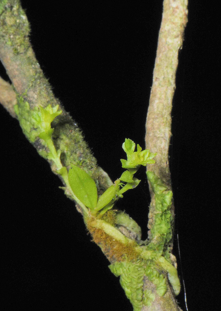 Found in central Taiwan and the Philippines on trees in coniferous and broad-leaved forests at elevations of 1000 to 1600 meters as a mini-miniature sized, cool growing, twig epiphyte with a short roots that are radiately adpressed to the mossy twig, giving rise to 2 to 4, small, narrowly oblong, oblanceolate to linear, subleathery, acute to acuminate leaves that blooms in the winter on often 2 to 3, erect to ascending, .6 to 1" [1.5 to 2.5 cm] long, winged, few flowered inflorescence with many sterile, ovate, slightly conduplicate bracts and similar floral bracts