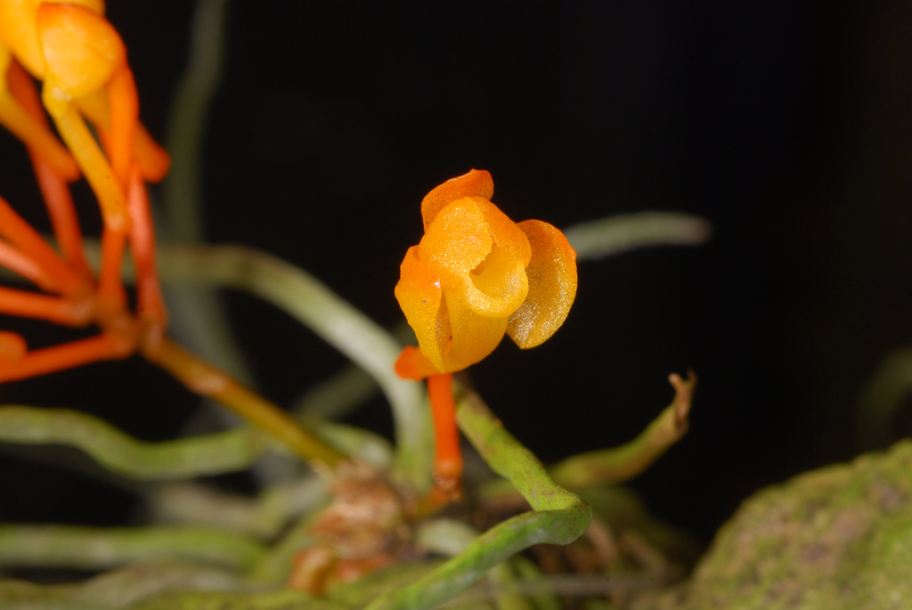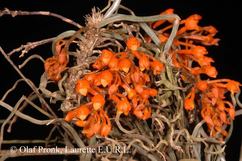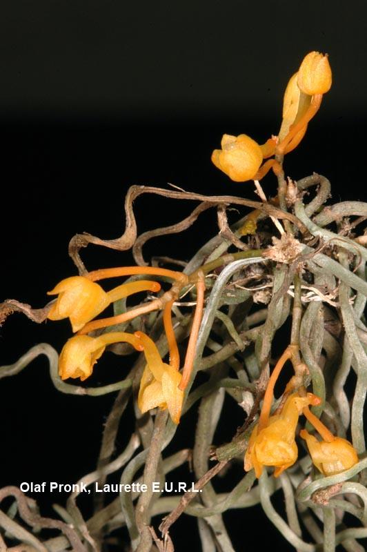 Found in eastern Madagascar in mossy rainforests on twigs and small branches at elevations of 100 to 1800 meters as a small sized, hot to cool growing epiphyte with no, to a very short stem carrying few to many, slender, very long, usually twisted, distally branching roots and blooming in the spring, summer and fall on up to 4, simultaneous, basal, terete, .6 to 1.36" [1.5 to 3.4 cm] long, very densely 10 to 12 flowered inflorescence with single nerved, acute, sheathing bracts and carrying non-scented flowers.