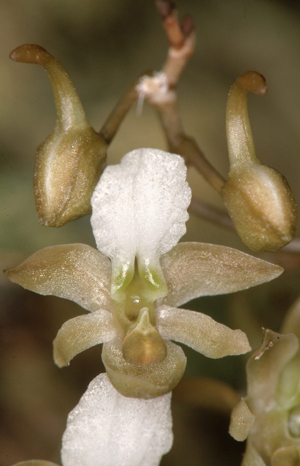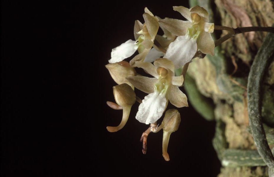 Found in southern Malawi in dry deciduous forests at elevations of 480 to 600 meters as a small to medium sized, hot to warm growing epiphyte with a short stem giving rise to green with white pneumophores, flattened with a slight ridge on top, tightly clinging roots that blooms in the late spring on 1 to 4, 1.2 to 2.8" [3 to 7 cm] long, zigzag, 5 to 17 flowered inflorescence with blackish bracts.