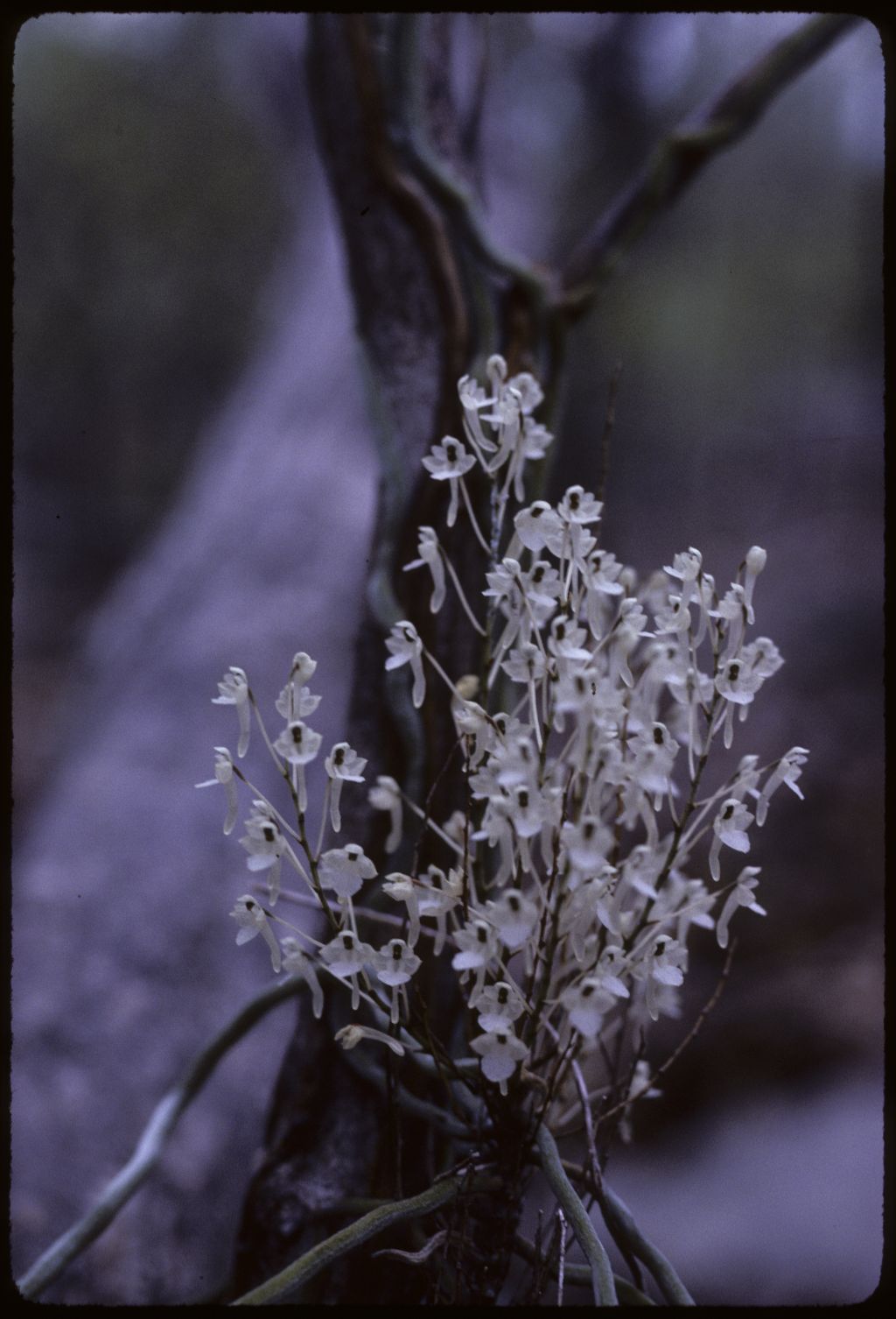 Found in Kenya, Tanzania and Madagascar in coastal bushlands and woodlands at elevations of sealevel to 500 meters as a small sized, hot growing epiphyte with a shorter stem carrying a few to many, radially spreading, attached to the substrate, mostly unbranched, flattened to rounded triangular, irregularily undulating roots that blooms in the fall and early winter on 6 to 15, simultaneously, erect-spreading, densely to 15 flowered inflorescence with distinctly sheathing, acute to subacute, single nerved bracts.