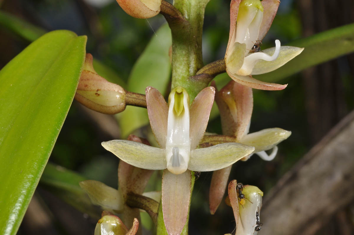Found in Rizal Province of the Philippines at medium elevations as a small to medium sized, warm to cool growing epiphyte with an upright, monopodial, cylindrical stem carrying leathery, narrowly elliptic to narrowly oblong leaves that blooms in the spring on an erect, 6.8" [17 cm] long, 15 to 20 flowered inflorescence with rigid, concave bracts and carrying non-resupinate flowers.