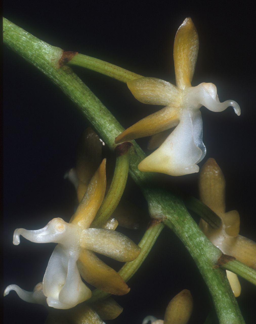 Found only in the Philippines at elevations up to 850 meters as a medium sized, hot to warm growing epiphyte with upright stems carrying several, very leathery, 2 ranked, alternate, unequally notched apically leaves that blooms in the fall and early winter on an erect, to 6'8" [200 cm] long, axillary, to 20 loosely flowered, racemose inflorescence carrying non-resupinate flowers