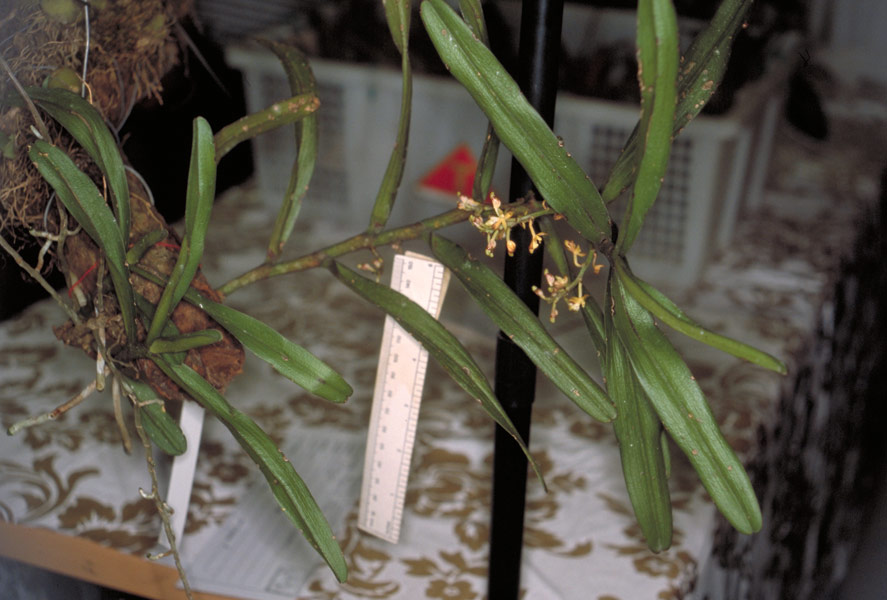 Found in the central mountains of southern Malaysia a medium sized, warm to cool growing epiphyte with untidy, elongate, freely branching stems carrying alternate, strap shaped leaves that blooms in the summer on an axillary, upwards curving, elongating, to 10 to 12" [25 to 30 cm] long, successively 10 to 12, many flowered inflorescence