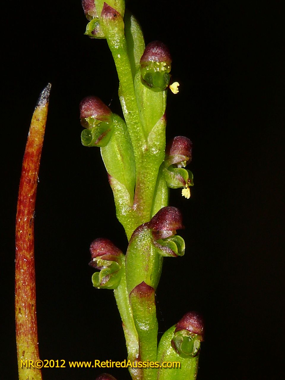 Found in southwest Western Australia often in standing water in paperbark swamp forest at elevations of 10 to 150 meters as a medium sized, cold growing terrestrial with a green to reddish single leaf that blooms in the later spring on an erect, 8 to 14" [230 to 35 cm] long, thin, 15 to 20 flowered inflorescence