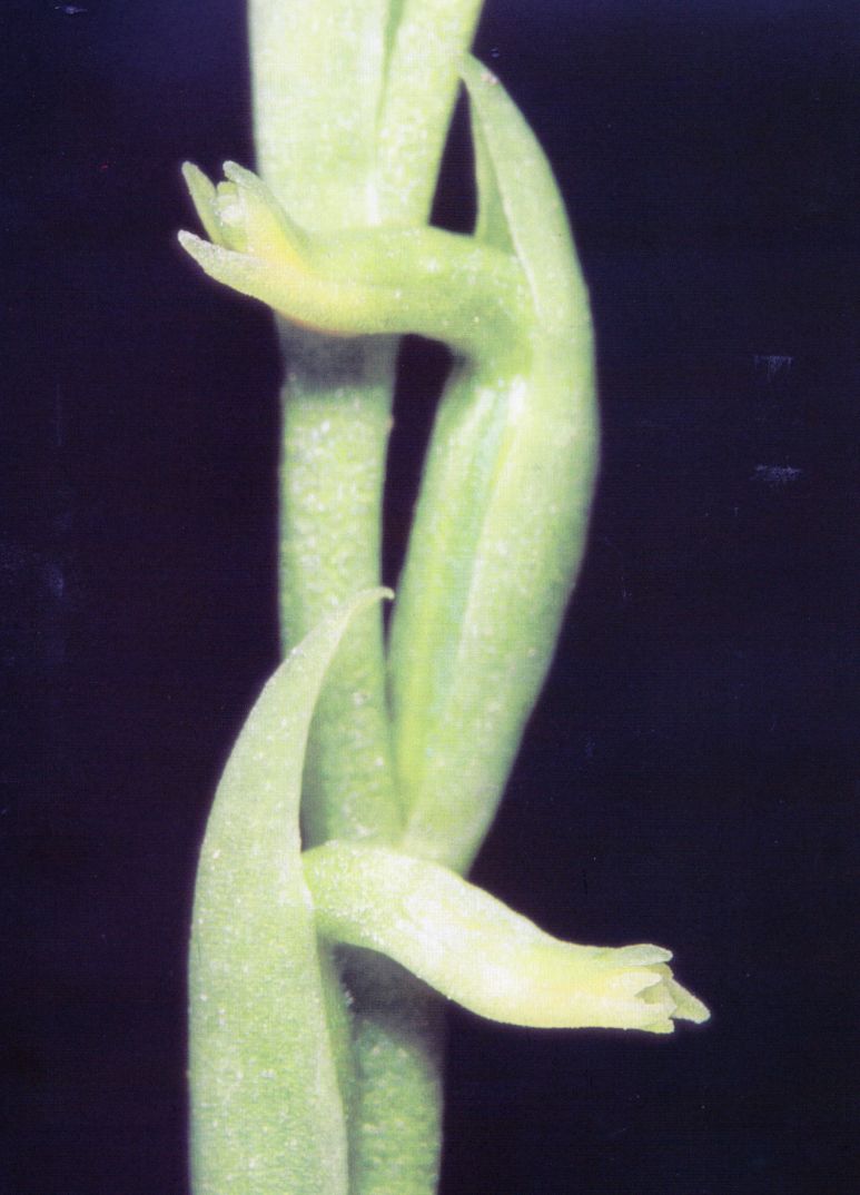 Found in Imbabura province of Ecuador at elevations around 2900 meters as a miniature to small sized, cold growing epiphyte with an erect stem carrying persistent, ovate, acute, gradually narrowing below into the petiolate base leaves that blooms in the late summer and early fall on an erect, to 7.2" [18 cm] long, few flowered inflorescence enveloped by infundibuliform sheaths.