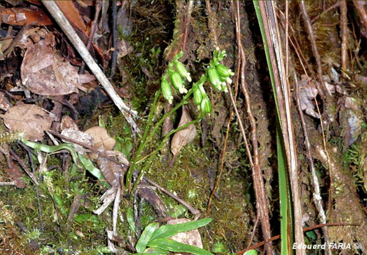 Found in New Caledonia in dense rain forests on mossy trees at elevations of 900 to 1600 meters as a mini-miniature sized, warm to cool growing epiphyte with flattened, roots that blooms in the winter, spring and summer on an erect, 4 to 8" [10 to 20 cm] long, successively several flowered inflorescence.