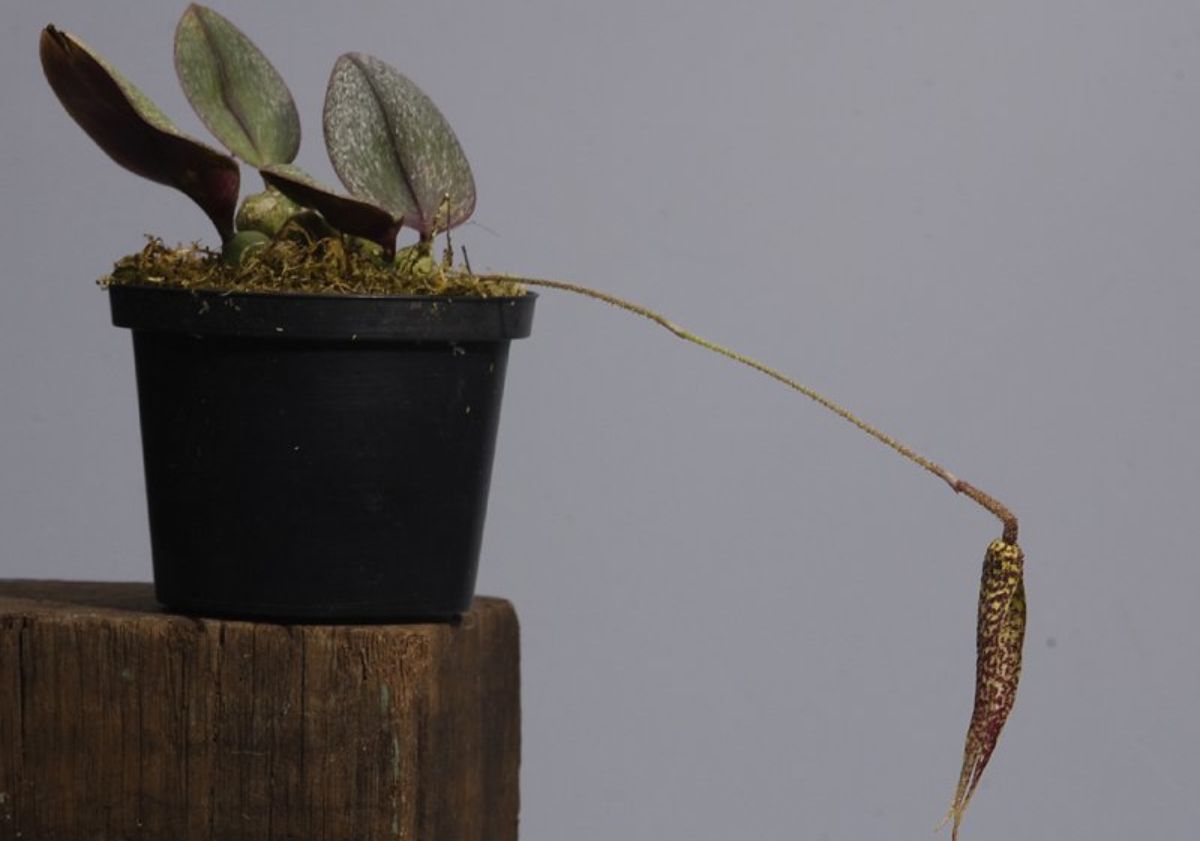Found in the Sulawesi Islands and New Guinea at elevations of 1300 meters as a miniature sized, cool growing epiphyte with .4" [1 cm] between each obliquely ovoid, sulcate, 4 angled pseudobulb carrying a single, apical, erect, elliptic, obtuse, contracted below into the sub-petiolate base leaf that blooms in the late fall on a densely muricate-papillose, 3.2 to 5" [8 to 12.5 cm] long, wiry inflorescence with 2 to 3 distant glabrous bracts, and a small glabrous floral bract carrying a single pendent, large, alien-looking, non-resupinate flower.