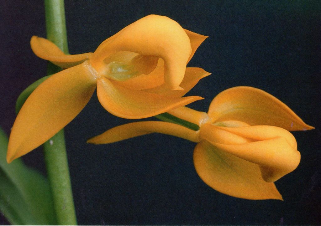 Found in Boyaca department of Colombia on the Eastern Cordillera in high thick, humid montane forests at elevations around 1000 meters as a small sized, warm growing epiphyte with fusiform pseudobulbsd enveloped by broad imbricating leaf sheaths and carrying several, plicate, articulate, deciduous, elliptic to oblanceolate, acuminate, bright green leaves that blooms in the fall on a basal, erect, peduncle terete, with 2 clasping, obtuse, scarious bracts, 10 to 14" [25 to 35 cm] long, simultaneously 5 to 10 flowered inflorescence with broadly ovate, somewhat concave, subacute floral bracts and carrying non-resupinate, deep orange yellow to canary yellow throughout, fragrant flowers .