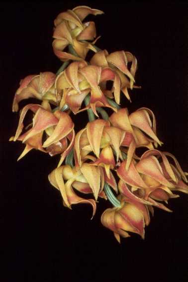 Found in Jalisco?, Guerrero, Oaxaca, Vera Cruz and Puebla states of Mexico and Guatemala as a medium to large sized, warm to cold growing epiphyte and occasional terrestrial in mountain rain forest on rotten wood at altitudes of 600 to 2200 meters with cylindric-fusiform pseudobulbs enveloped completely by imbricate, scarious leaf sheaths that carry plicate, deciduous, oblanceolate to narrowly elliptic, acuminate leaves that blooms in the fall and early winter on a racemose, arcuate, to 20" [50 cm] long, one-sided inflorescence that arises from the base of an immature growth, carrying up to 30, showy, facing upwards, foul smelling.