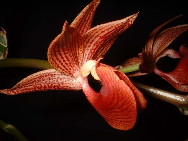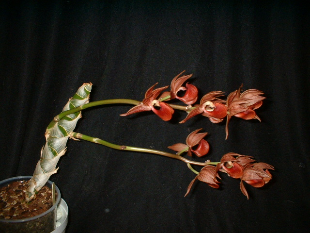This orchid is a small to medium sized, hot to warm growing epiphyte found in Panama, Venezuela and Colombia at elevations below 1000 meters with subcylindrical, articulate pseudobulbs enveloped completely by leafless and leaf-bearing sheaths and carrying 3 to 4, from near the apex, deciduous, linear-lanceolate, acuminate, gradually narrowing below into the somewhat conduplicate, attenuate base leaves that blooms in the fall on 1 to 3, from the middle of the pseudobulb, racemose, densely many flowered, erect, to 6" [15 cm] long inflorescence.
