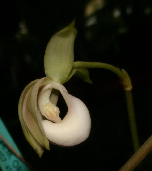 Found as a small to medium sized, warm to hot growing epiphyte from western Ecuador in tropical wet forests at elevations of 100 to 1000 meters with conic-ellipsoid, very fleshy pseudobulbs enveloped completely by imbricate, foliaceous sheaths carrying 6 to 8, thin, narrowly elliptic to obovate, plicate, subpetiolate, acuminate, deciduous leaves that blooms in the summer through winter on an erect, to 14" [35 cm] long, few flowered inflorescence that arises from near the bottom of a mature leafless pseudobulb.