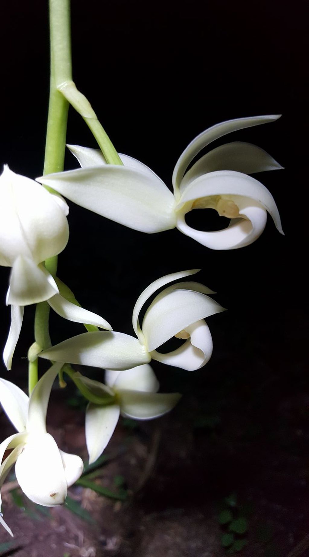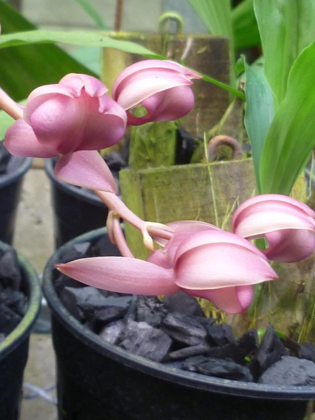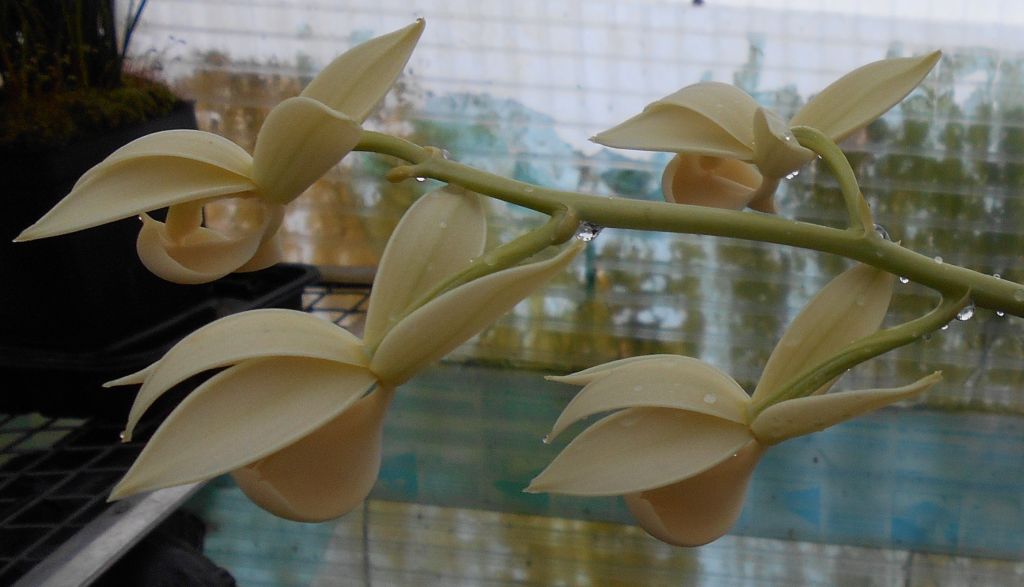 Found in Nicaragua and Costa Rica in wet Caribbean slope montane forests at elevations of 390 to 800 meters as a small sized, hot growing epiphyte with oblong-conical, slightly compressed pseudobulbs carrying plicate, elliptic leaves that blooms in the winter without leaves on a basal, to 8" [20 cm] long, 3 to 4 flowered, racemose inflorescence with 5 distant bracts and membraneous, triangular-ovate, acute floral bracts carrying fragrant flowers.