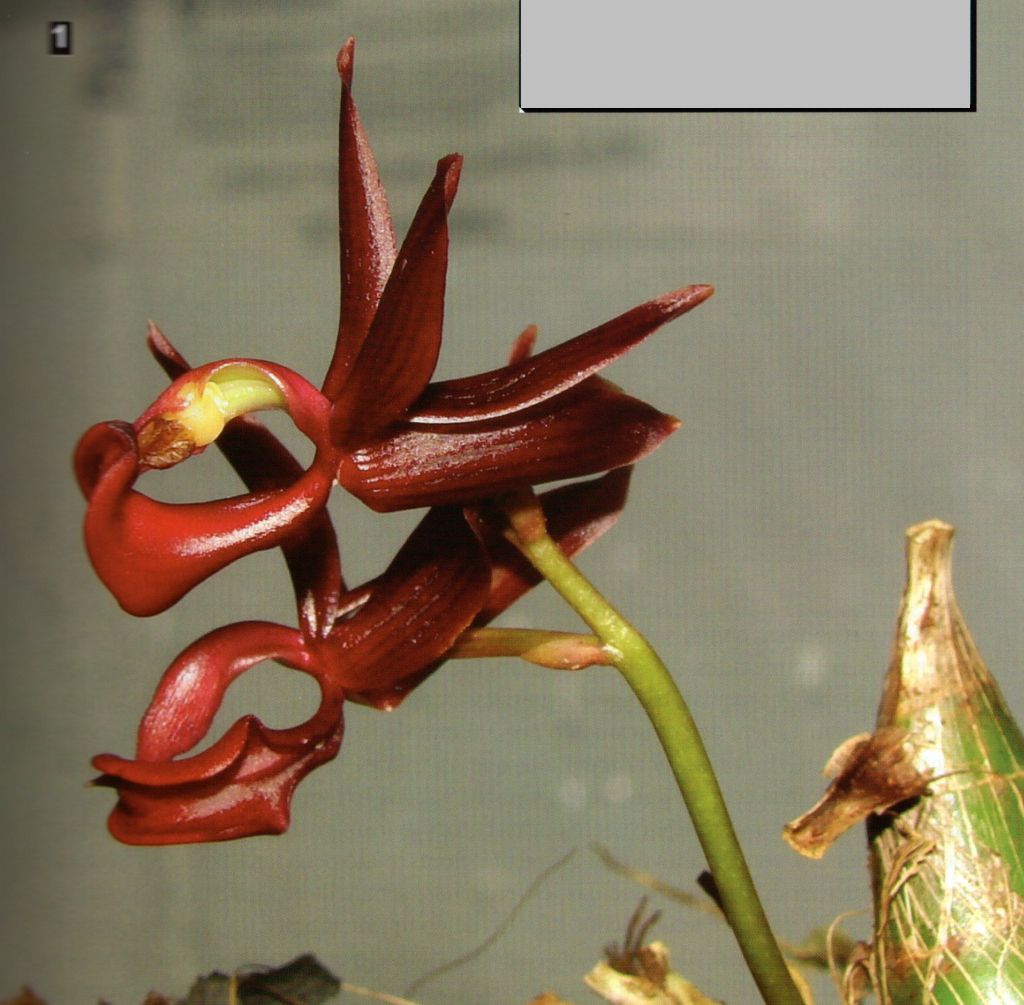 Found in Mato Grosso state of Brazil in Amazon forests on a dead tree at elevations around 600 meters as a miniature sized, warm growing epiphyte with an inconspicuous rhizome giving rise to fusiform, clustered, attenuate towards the uppewr end pseudobulbs carrying enveloped basally by membraneous leafbearing sheaths carrying plicate, oblong-lanceolate, thin, green, deciduous leaves that blooms in the winter on a lateral, suberect, racemose, slightly arched, longer than the pseudobulbs, 1" [2.5 cm] long, rachis green, simultaneously 1 to 2 flowered inflorescence with persistent, cream colored floral bracts and carrying glabrous, resupinate flowers.
