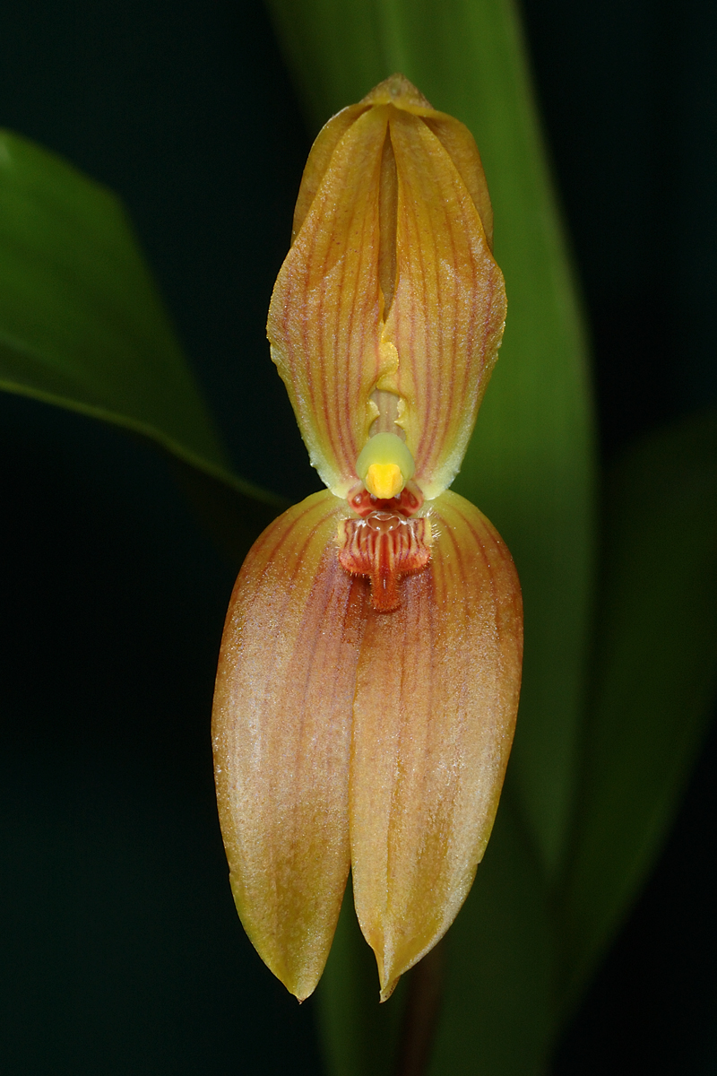 Found in Colombia, Ecuador and Peru in wet montane forests at elevations of 900 to 1100 meters as a small to medium sized, warm to cool growing epiphyte with tapered conic, 4 angled, ancipitous pseudobulbs enveloped basally by a few scarious, distichous, leafless sheaths and carrying 3 apical, narrowly elliptic, coriaceous, acute, narrowing below into the conduplicate, petiolate base leaves that blooms in the fall on a basal, nearly erect, 9 1/4" [23 cm] long, single flowered inflorescence with 3, basal tubular, imbricate, acuminate bracts and up to 8 subremote, tight, tubular, acute bracts .
