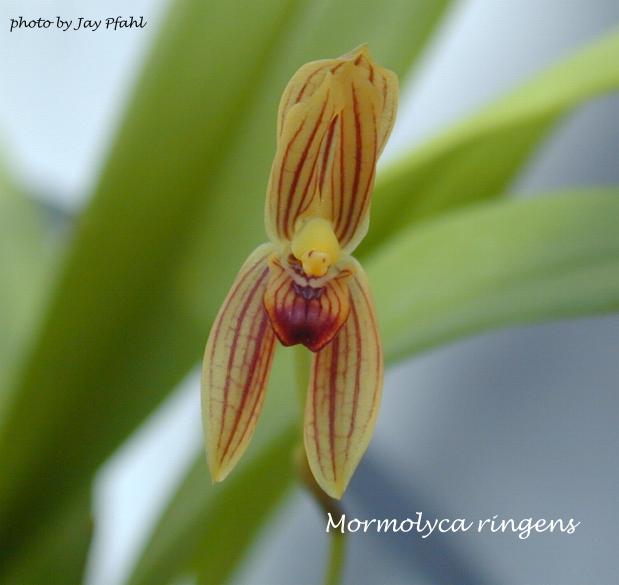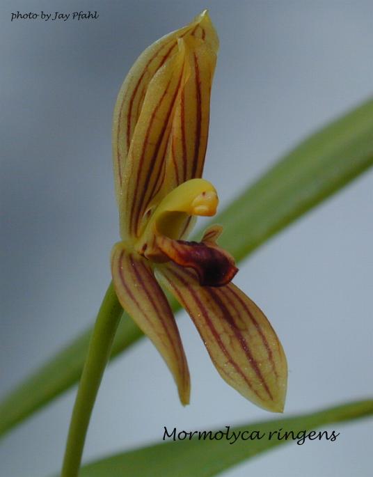 References W3 Tropicos, Kew Monocot list , IPNI ; Die Orchideen Schlechter 1915 as Mormolyze ringens; Encyclopedia of Cultivated Orchids Hawkes 1965; Las Orquedias De El Salvador Vol 2 Hamer 1974 drawing/photo fide; Icones Planetarum Tropicarum plate 878 Dodson 1983 drawing fide; An Introdution to the Orchids of Mexico Wiard 1987 photo fide; AOS Bulletin Vol 57 No 2 1988 photo; Orchids Travel By Air A Pictoral Safari Mulder, Mulder-Roelfsema and Schuiteman 1990 photo fide; The Manual Of Cultivated Orchid Species Bechtel, Cribb & Launert 1992 photo fide; Rudolf Schlechter Die Orchideen lieferung 29 1777 - 1840 Brieger 1994 drawing/photo fide; Guatemala Y Sus Orquideas Behar & Tinschert 1998 photo fide; Fieldiana Biology, Flora Costa Ricensis Family # 39 Orchidaceae, subtribes Maxillariinae and Oncidiinae Atwood & Mora 1999 drawing fide; Harvard Pap. Bot. 5 #2: Carnevali etal. 2001; Manual de Plantas de Costa Rica Vol 3 Hammel, Grayum, Herrera and Zamora 2003 drwaing fide; Algunas Orquideas de Oaxaca Suarez 2004 photo fide; Mille et Une Mini Orchideees Roguenant 2009 photo fide; Orchid Digest Vol 74 #1 2010 photo fide; AOS Bulletin Vol 80 #2 2011 photo fide; Guia de Orquideas de Chiapas Carlos Rommel Beutelspacher Baigts 2013 photo fide; Algunas Orquideas de Mexico Tomo 1 Suarez 2013 photo fide; Of Men and Orchids Part 1 Jenny 2015 drawing/photo fide; Orchid Genera and Species in Guatemala Archila, Szlachchetko, Chiron, Lipinska, Mystkowska and Bertolini 2018 photo fide; Vanishing Beauty, Native Costa Rican Orchids Vol 2 Lacaena to Pteroglossa Pupulin 2020 photo fide