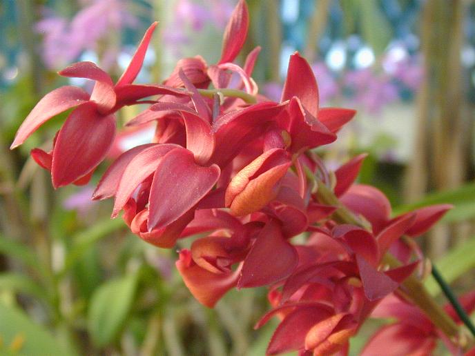 This species comes from Amazonas state of Brazil in Amazon rainforest at elevations around 100 meters as a medium sized, hot growing epiphyte with close set, elliptic-lanceolate to fusiform, slightly compressed laterally pseudobulbs enveloped completely by leaf bearing sheaths and carrying numerous, oblong-lanceolate, acute leaves and has an erect, 4" [10 cm] long, several to 25 flowered inflorescence that arises from the lower third of a mature leafless pseudobulb occuring in the fall in the southern hemisphere.