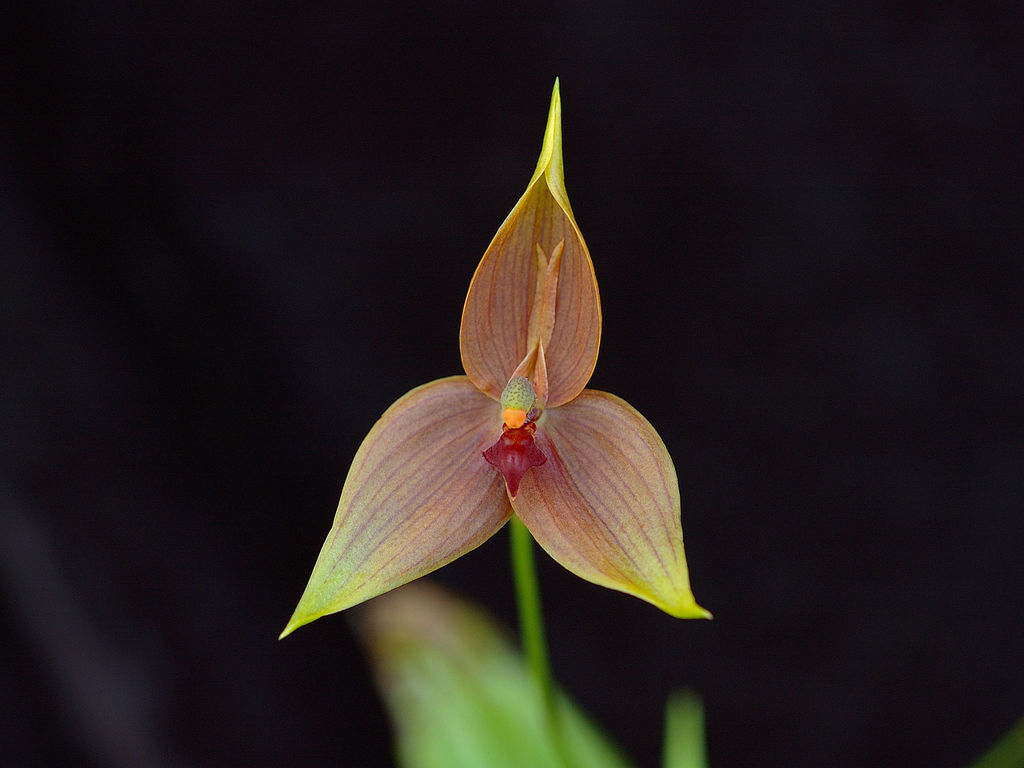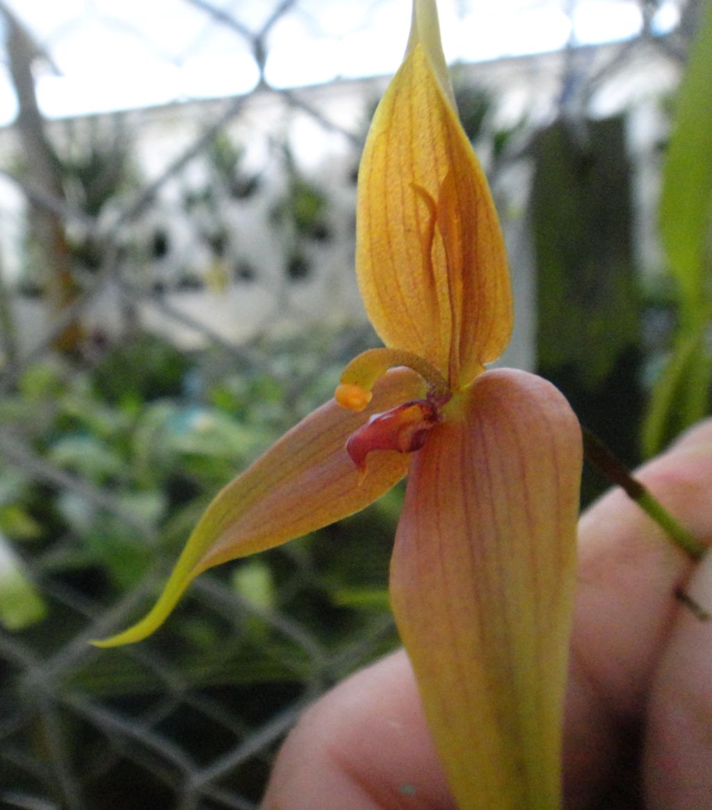 Found in Peru at elevations of 1500 to 2000 meters as a small sized, cool growing epiphyte with a creeping rhizome carrying well spaced, cylindrical, laterally compressed pseudobulbs carrying a single, apical, erect, coriaceous, lanceolate, acute, gradually narrowing below into the conduplicate, shortly petiolate base leaf that blooms at most any time of the year on an erect, basal, 6" [15 cm] long, single flowered inflorescence.