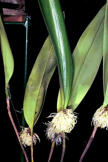 Found in Costa Rica, Colombia, Ecuador, Peru and Bolivia in wet montane forests at elevations of 350 to 2400 meters as a large sized, hot to cold growing epiphyte with stout, erect ramicauls enveloped basally by 5 to 10, long, tubular, hispidous sheaths carrying a single apical, erect, thickly coriaceous, narrowly ovate, acute leaf that is cuneate below into the subpetiolate base that blooms in the winter and spring on a fascile of a few to many, single, simultaneously opening flowers arising from the apex of the ramicaul with the minutely pubescent peduncle being .32" to .6" [8 to 15 mm] long, and infundibular, pubescent floral bracts.