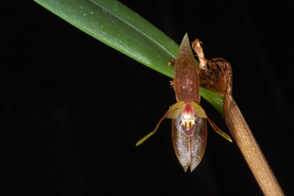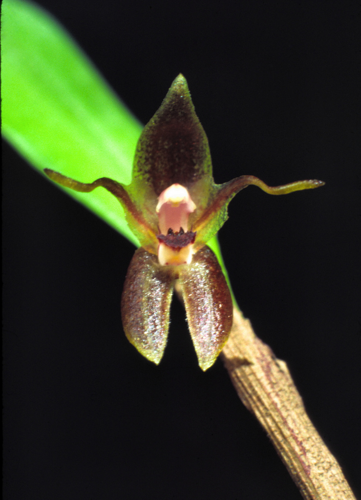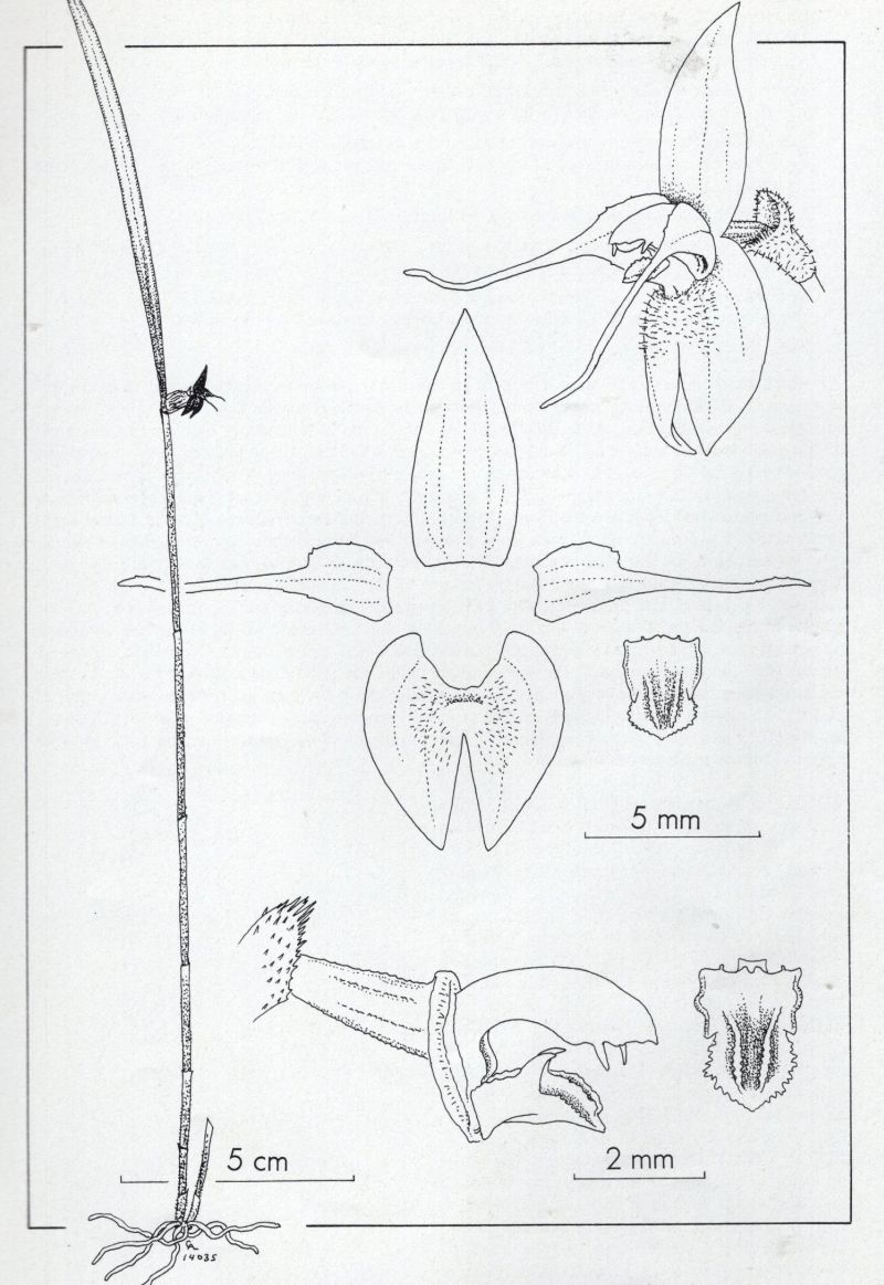 Found in southeastern Ecuador to northeastern Peru at elevations of 1100 to 2200 meters as a medium sized, cool to cold growing epiphyte with slender, erect ramicauls enveloped basally by 5 to 8, long, tubular, hispidulous sheaths and carrying a single, apical, erect, coriaceous, very narrowly linear-ovate, acute, gradually narrowing below into the sessile base leaf that blooms in the fall on a congested fascile of successive, single flowers arising from the apex of the ramicauls.