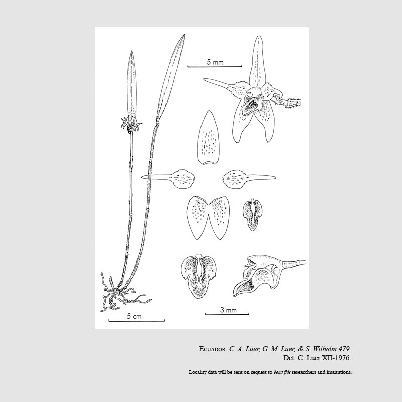 Found in Pastaza province of Ecuador at elevations around 1000 meters as a small sized, warm to cool growing epiphyte with a slender, erect ramicaul enveloped by 5 to 6 reddish purple, hispid sheaths and carrying an erect, coriaceous, narrowly elliptical, acute, narrowly cuneate below into the subpetiolate base leaf that blooms in the winter on a fascile of .08 to .12" [2 to 3 mm] successively single flowered inflorescence with 1 to 3, simultaneous flowers, arising at the apex of the ramicaul with red pubescent floral bracts.