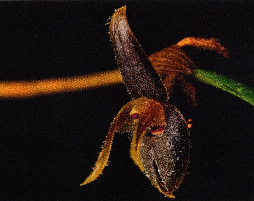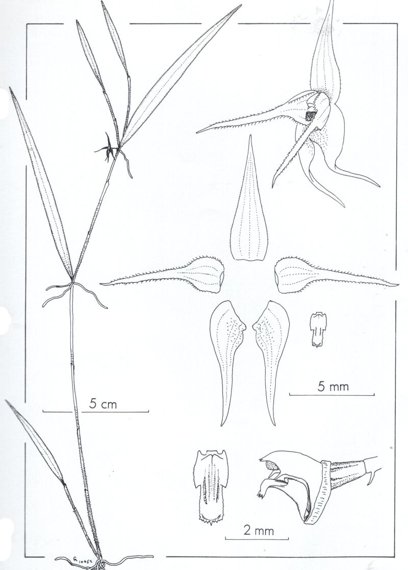 Found in southeastern Ecuador and northern Peru at elevations of 1100 to 1500 meters as a small sized, cool growing, scandent epiphyte with slender, erect, prolific ramicauls enveloped by 3 to 9 minutely hispidulous, tubular sheaths and carrying a single, apical, suberect, coriaceous, narrowly elliptical-ovate, acute, gradually narrowing below into the subpetiolate base leaf that blooms in the spring and summer on a .1" [1 to 2 mm] long, single flowered inflorescence arising at the apex of the ramicaul, and has tubular, pubescent floral bracts.