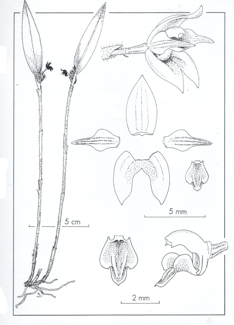 Found in southeastern Ecuador in cloud and swamp forests at elevations of 500 to 1450 meters as a medium sized, warm to cool growing epiphyte with slender to stout, erect ramicaul enveloped almost completely by 4 to 8, hispidous, long-tubular sheaths and carrying a single, apical, erect, coriaceous, narrowly ovate, acute, cuneate below into the subpetiolate base leaf that blooms in the late winter through summer on a fascile of single, successive flowers arising at the apex of the ramicaul and has pubescent floral bracts.