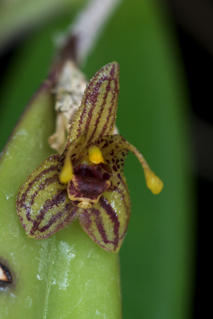 Found in Colombia and Venezuela at elevations around 2300 to 2500 meters as a mini-miniature sized, cold growing epiphyte with erect ramicauls enveloped by 3 to 7, tubular, hispidulous sheaths and carrying a single, apical, erect, thickly coriaceous, narrowly elliptical-ovate, acute, cuneate below into the subpetiolate base leaf that blooms in the fall and winter on a fascile of .05" to .1" [1 to 2mm] long, single successive flowers arising from the apex of the ramicual