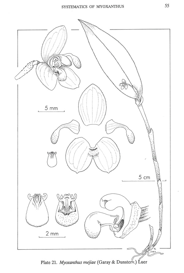 References W3 Tropicos, Kew Monocot list , IPNI ; Venezuelan Orchid Illustrated Vol 6 Dunsterville & Garay 1976 as Pleurothallis mejiae drawing fide; Icones Pleurothallidinarum Vol IX Systematics of Myoxanthus Luer 1992 drawing fide;