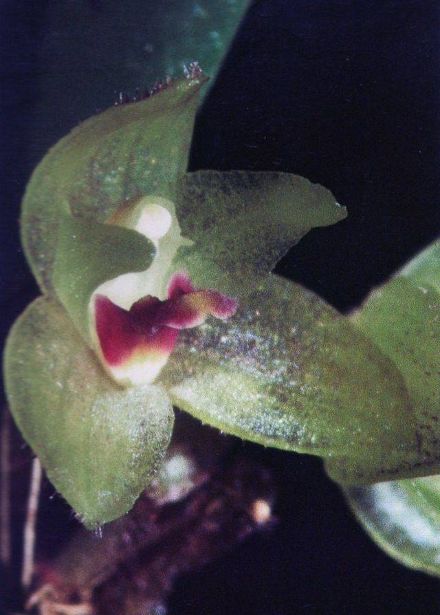 Found in central to southern Ecuador in forests at elevations of 950 to 1200 meters as a miniature to small sized, warm to cool growing epiphyte with slender, erect, ramicuals enveloped by 4 to 6 tubular, hispidulous sheaths and carrying a single, apical, erect, coriaceous, narrowly elliptical-ovate, acute, gradually narrowing below into the subpetiolate base leaf that blooms in the summer and early fall on a .04 to .08" [1 to 2 mm] long, successively single flowered inflorescence arising from near the apex of the ramicaul with tubular, pubescent floral bracts that envelop both the pedicel and ovary.
