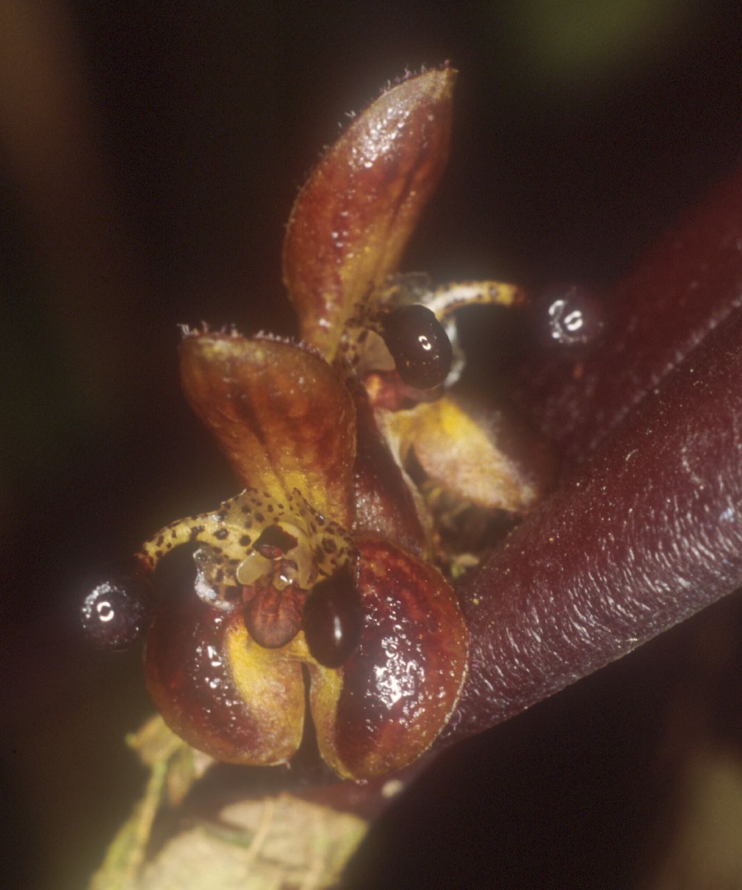 Found in Venezuela, Colombia and Ecuador presumably in cloud forests at elevations of 1200 to 3500 meters as a medium sized, cool to cold growing epiphyte or terrestrial with stout, erect, ramicauls enveloped basally by 5 to 9 hispidulous, tubular sheaths carrying a single, apical, erect, coriaceous, narrowly ovate, acute leaf that is cuneate below into the subpetiolate base and blooms in the summer, fall and winter on a fascile of single, successive flowers on a very short inflorescence that arises from the apice of the ramicaul with pubescent floral bracts.
