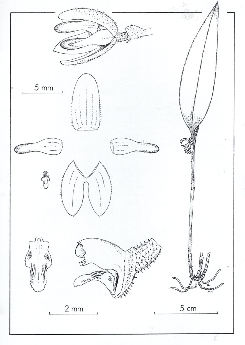 Found in Ecuador at elevations around 600 meters as a small sized, warm growing epiphyte with stout, erect, ramicauls enveloped by 5 to 6, hispidulous, tubular sheaths and carrying a single, apical, erect, coriaceous, narrowly ovate, acute, cuneate below into the conduplicate, petiolate base leaf that blooms in the summer on a fascile of many, congested, .1" [1 to 2 mm] long, successively single flowered inflorescence arising at the apex of the ramicaul, with pubescent floral bracts and has 1 to 6 simultaneously open flowers. CAUTION! Although all photos on the net depict the same flowers as here, I have reservations as to the photo determination. Luer states that this species is distinguished by the pubescent externally sepals, the thick AND TERETE above the middle petals a denticulate lip and the column that is toothed at the apex. PLEASE USE CAUTION!!!! Luer's drwaing is absolutely correct!