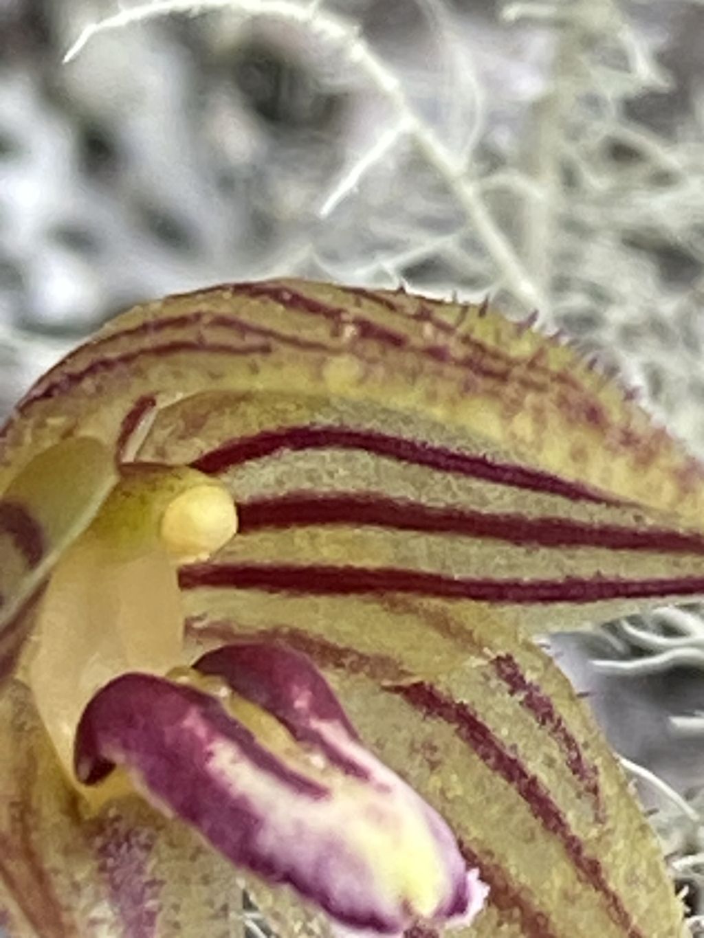 Found in Guatemala, Costa Rica, Panama, Venezuela, Colombia and Ecuador in cloud forests at elevations of 2000 to 2900 meters as a medium to large sized, cold growing epiphyte with erect, stout, purplish ramicauls enveloped by 4 to 8, tubular, hispidulous sheaths and carrying a single, apical, erect, thickly coriaceous, dark green, suffused with purple, narrowly ovate, acute, cuneate below into the petiolate base leaf that blooms in the winter on a congested fascile of several, .2 to .4" [.5 to 1 cm] long, single, simultaneous flowered inflorescence arising often through a dense mass of old nodes at the apex of the ramicaul with infundibular, minutely spiculate enveloping the stout, minutely pubescent pedicel.