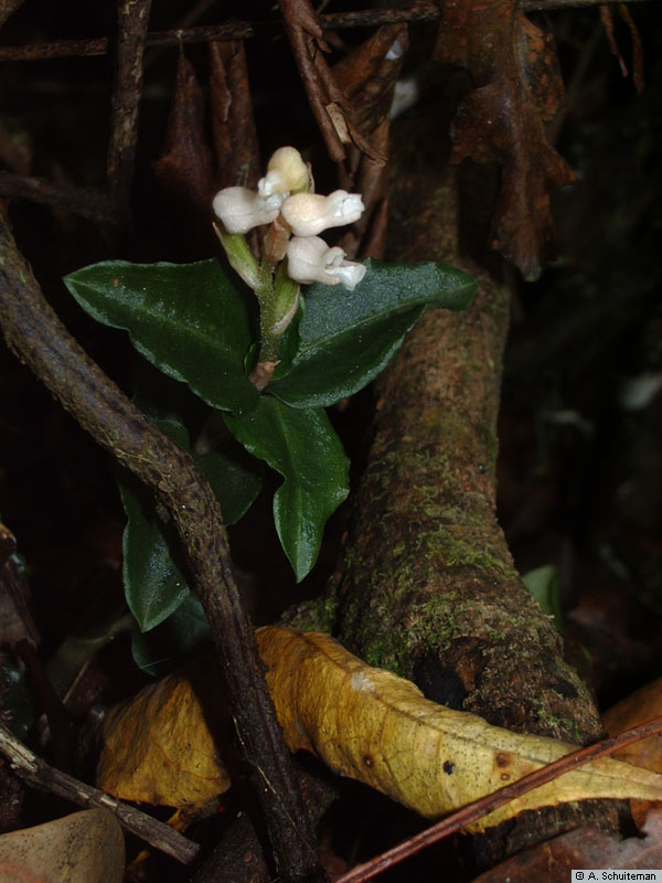 Found in Java in montane cloud forests at elevations of 1500 to 2800 meters as a miniature sized, cool to cold growing terrestrial with erect stems carrying 8 to 9, ovate, acute, undulate margined, basally clasping leaves that blooms on a terminal, very short, glabrous, to 3 flowered inflorescence.