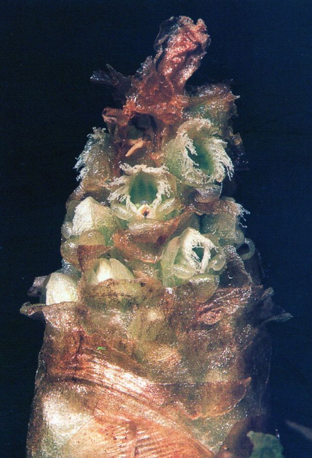 Found in Colombia, Ecuador and Bolivia? at elevations around 3000 meters as a miniature sized, cold growing terrestrial with fasciculate, fusiform, fleshy roots giving rise to rosulate, deciduous, ovate-elliptic to elliptic, acute leaves that blooms on a lateral, peduncle completely enveloped by imbricating, loose sheaths decreasing in size upwards into the bracts, rachis densely many flowered inflorescence with hyaline, irregular margined, reddish brown, shorter than the flower floral bracts and carrying white flowers.