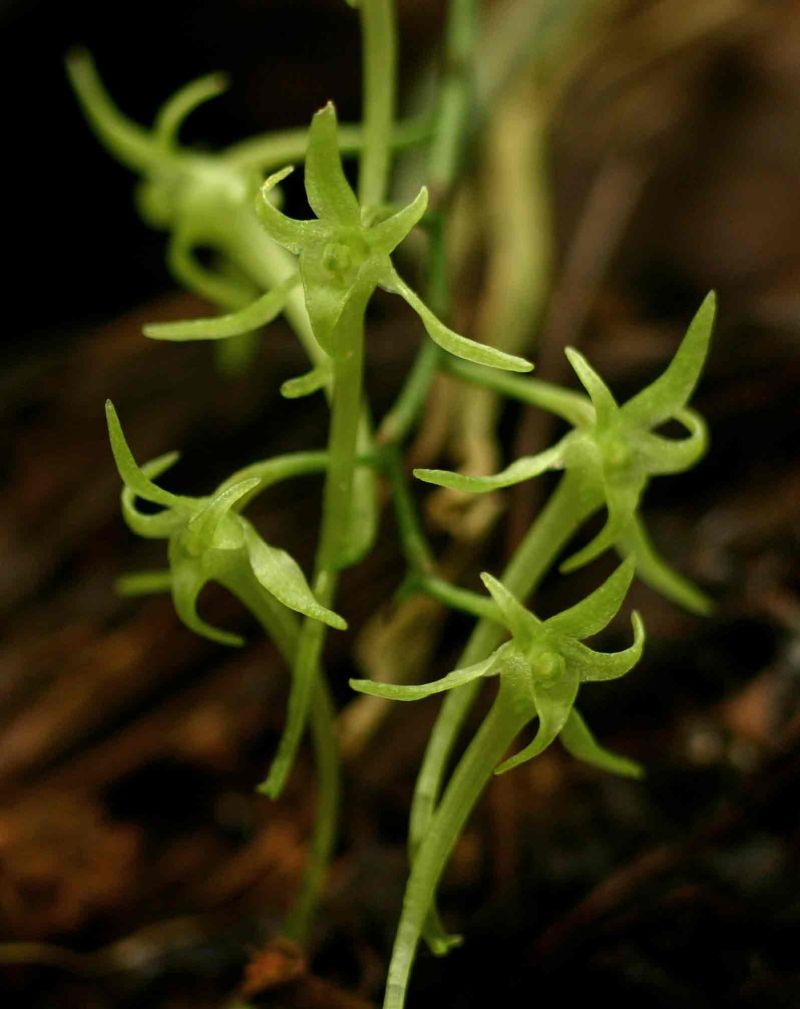 Found in Tanzania, Malawi, Zambia and Zimbabwe in sub and montane forests on twigs and small branches at elevations of 1300 to 2500 meters as a miniature sized, cool to cold growing epiphyte with almost no stem carrying 2 to 5, oblanceolate, unequally and obtusely bilobed apically, dark green, reticulated and raised venation leaves that blooms in the summer on 1 to several, pendant, terete, very fine, wiry, .6 to 4" [1.5 to 10 cm] long, fairly laxly 1 to 12 flowered inflorescence with nocturnally scented flowers.