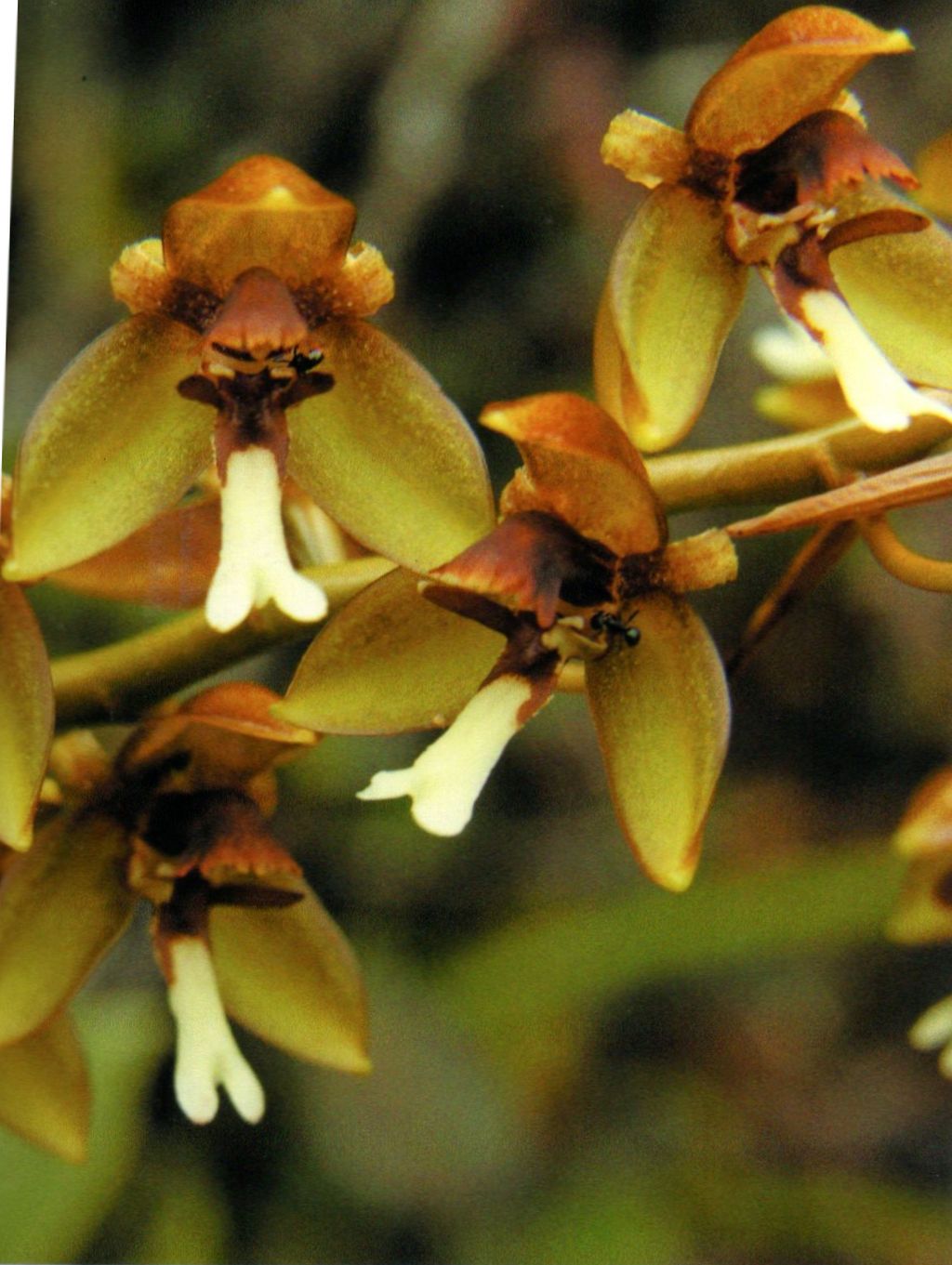 Found in Sarawak Borneo on boulders at elevations of 2000 to 2350 meters as a medium to large sized, cold growing lipthophyte with slender, longitudinally rugose, cylindrical pseudobulbs carrying a single, apical, stiff, coriaceous, 7 to 9 nerved, lanceolate to linear, acute, narrrowing below into the petiolate base leaf that blooms in the fall on a synanthous, peduncle 4.8 to 8" [12 to 20 cm] long, rachis 5.6 to 12" [14 to 30 cm] long, 25 to 41 flowered inflorescence with ovate, apcailly truncate floral bracts.