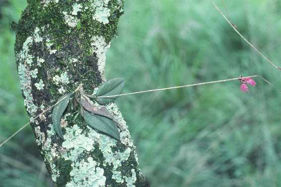 Found in Mexico, Guatemala, El Salvador and Honduras from sea level up to 1500 meters on horizontal, mossy branches of trees on rocky hillsides as a small sized, cool to warm growing epiphytic species is from with slender, erect, pseudobulbous, clavate stems carrying a basally clasping, lanceolate or ovate-lanceolate, acute or subacute, coriaceous, green leaves that are spotted bronze-purple that blooms in the summer and carries non-fragrant flowers.