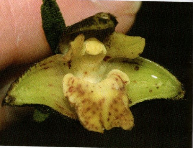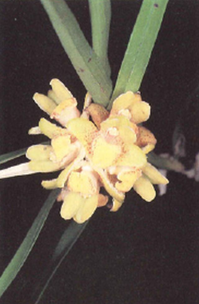 Found from Mexico and Guatemala at elevations around 2000 meters as a medium sized, cool to cold growing lithophyte with erect, branching, reed-like, terete stems carrying leafy above, erect to slightly arcuate, distichous, narrowly linear-lanceolate, obtuse-rounded leaves that blooms in the late winter and early spring on a terminal or at the nodes of defoliated stems, short, subsessile, successively single to few flowered inflorescence with elliptic subquadrate floral bracts.