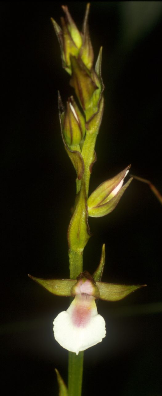 Found in eastern Cape and Natal, and Orange Free State and Transvaal provinces of South Africa at elevations of 1200 to 2350 meters in montane marshy grasslands as a medium szied, cool to cold growing terrestrial with slender stems arising from 2 basal, narrowly elliptic to oblong leaves and a few smaller ones above which arise from small egg-shaped tubers and bloom in the summer on a lax, 2 to 12 flowered inflorescence.