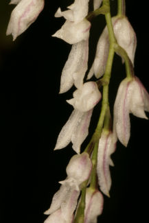 Found in Peru in cold, wet cloud forests at elevations around 2500 to 1600 meters as a medium szied, cold growing epiphyte with narrowly ovoid, gently curved pseudobulbs subtended by foliaceous bracts that are shorter than the leaves and carrying a single, linear, widest towards the apex, acute, petiolate base leaf that blooms in the summer on an axillary, erect, paniculate, branches short, each 5 to 8 flowered, to 11.2" [28 cm] long overall, many flowered inflorescence with minute, lanceolate-triangular, acute, half the length of the ovary floral bract and carrying campanulate flowers.