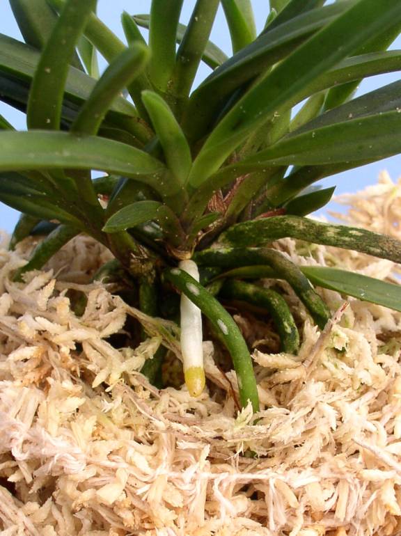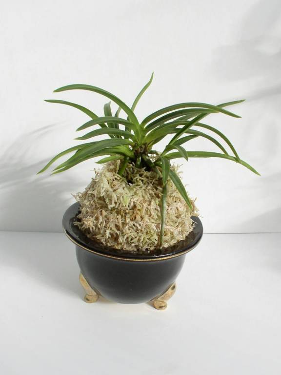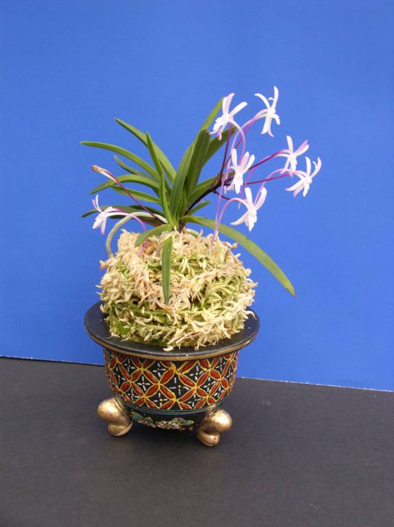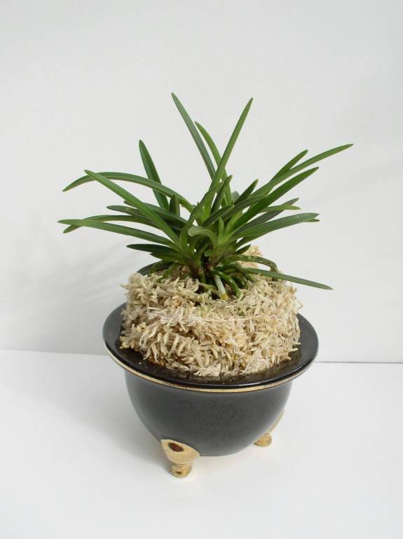 Best mounted on tree fern or cork yet it can be done in suspended pots with a very coarse mixture to allow air to get to the roots. The plant is a miniature to small sized, monopodial, vandanaceous plant that is under 5" tall.