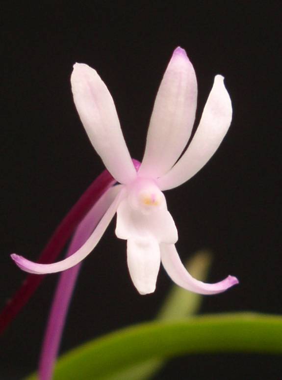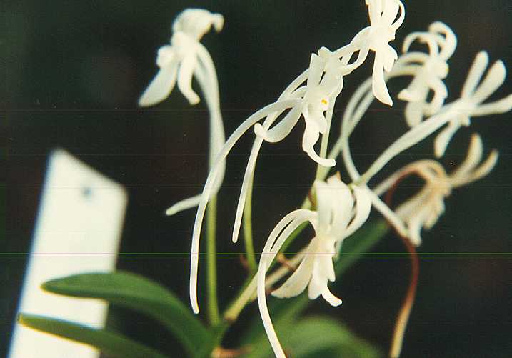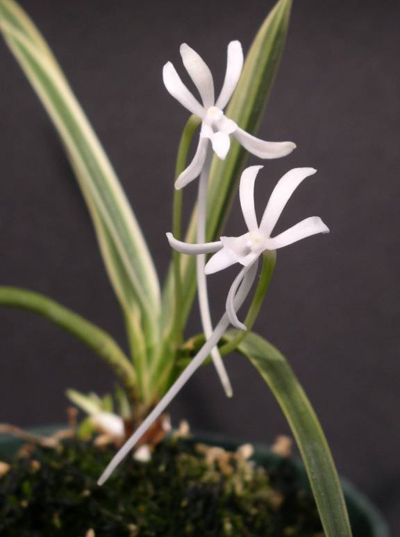 From Japan, Korea and the Ryukyu Islands, as a cool to cold growing epiphyte, found in areas that have shady summers, and because of the deciduous trees that they grow on, almost full sun in the winter, with a short, monopodial, complanate stem enveloped basally by conduplicate leaf bases carrying coriaceous, distichous, fleshy, conduplicate, linear-falcate leaves that blooms on a racemose, axillary, to 2/3/4" [7 cm] long, laxly several flowered inflorescence that appears in early summer through fall with nocturnal, fragrant jasmine to vanilla scented flowers.