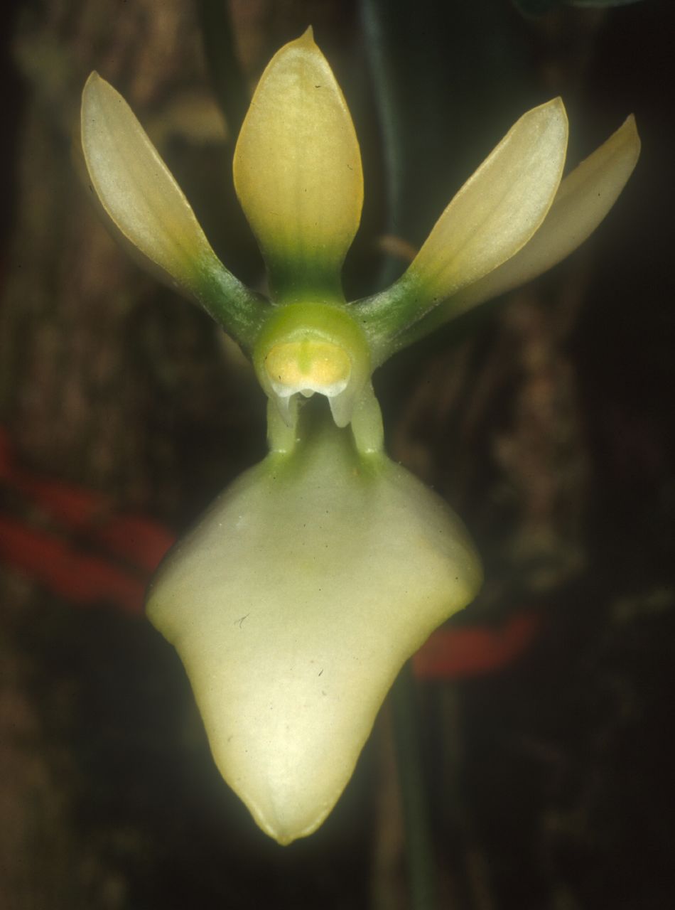 Found in Madagascar and the Comoros Islands on twigs and branches as a miniature sized, cool growing, monopodial epiphyte at elevations around 1000 to 1500 meters with short stems carrying 4 to 5, ligulate to elliptic, unequally obtusely bilobed apically leaves that produces in the spring a single flower per basal, 3 1/8" to 7 1/8" [8 to 18 cm] long, inflorescence that is shorter than the leaves with deltoid-ovate bracts.