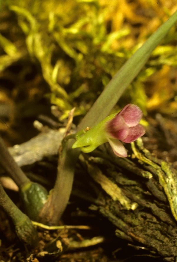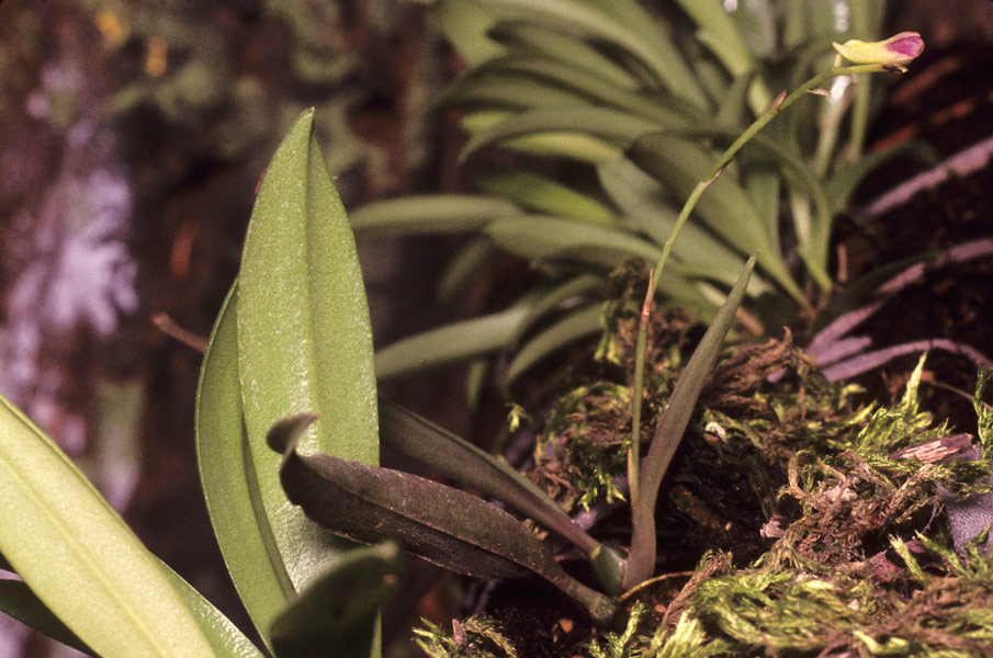Found in Junin Peru in wet montane forests without locational inflormation as a miniature sized, warm to cool, twig growing epiphyte with narrowly to broadly elliptic, lightly complanate, sulcate pseudobulbs subtended by 2 pairs of imbricate, scarious, grading larger above sheaths and carrying a single, apical, linear-lanceolate, acute, coriaceous, conduplicate below into the petiolate base leaf that blooms in the fall on 1 to 2, axillary, erect, scapose, terete, slender, stiff, to 5.2" [13 cm] long, densely flowered inflorescence with 3 to 4 distant, small, ovate bracts and narrowly ovate floral bracts.