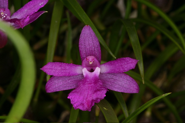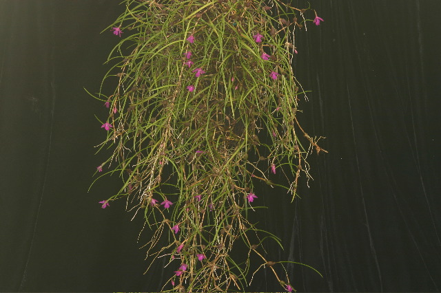 Found in southern Brazil at moderate elevations in cool damp mountains as a miniature sized, cool growing epiphyte with an elongate, creeping, branched rhizome with narrowly ovoid pseudobulbs enveloped basally by fibrous sheaths and carrying a single, apical, coriaceous, narrowly linear, subterete leaf that blooms in the late fall on a terminal, 2" [5 cm] long, thread-like, erect to arching, single flowered inflorescence that is held amid the leaves and is best mounted on cork or tree fern and given moderate shade.