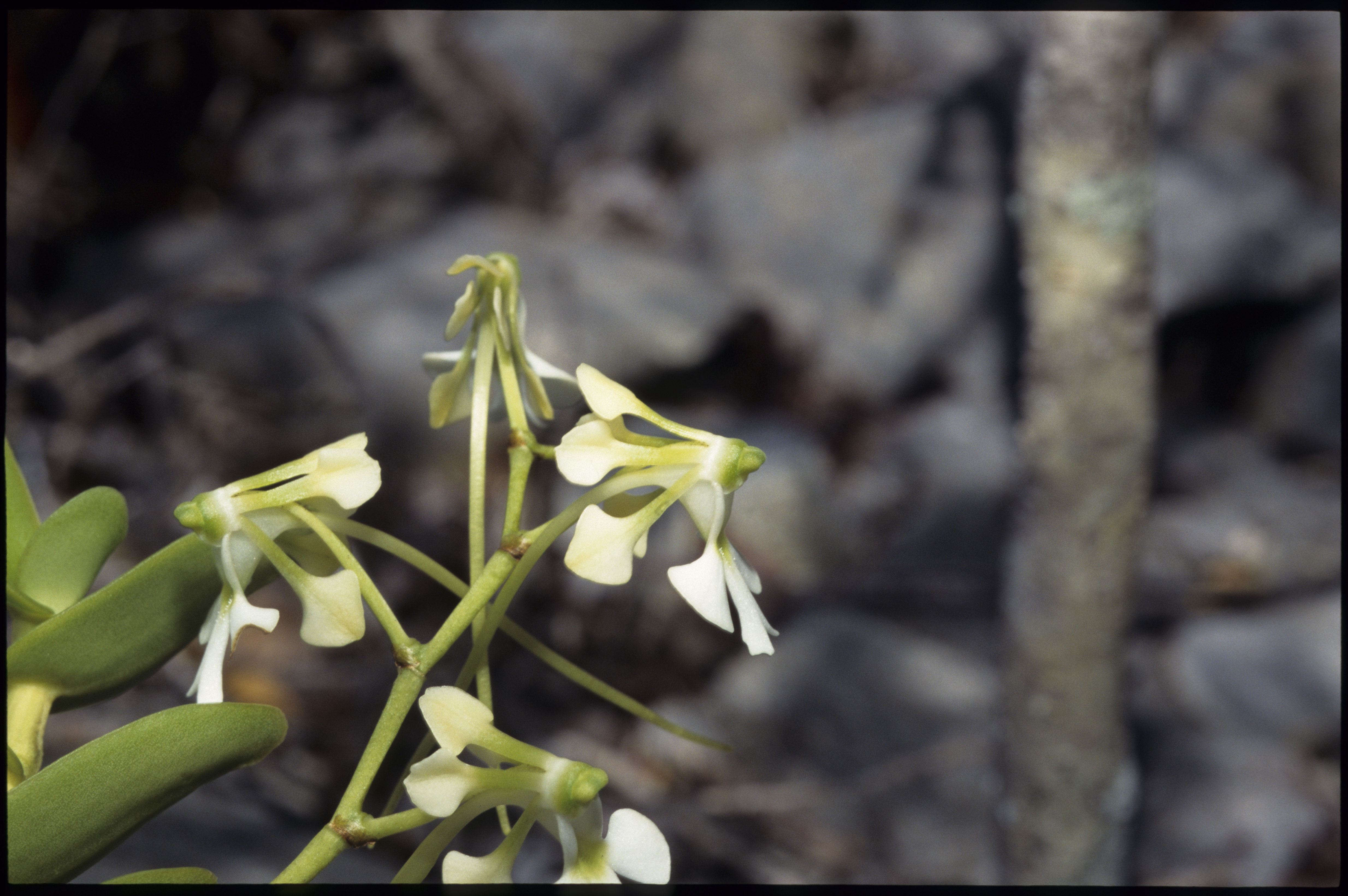 Inflorescence and Plant in situ on rocks Madgascar Photo by © Labat and Mobot Madagascar Photo List Common Name The Shovel-Like Neobathiea [refers to the shape of the sepals]